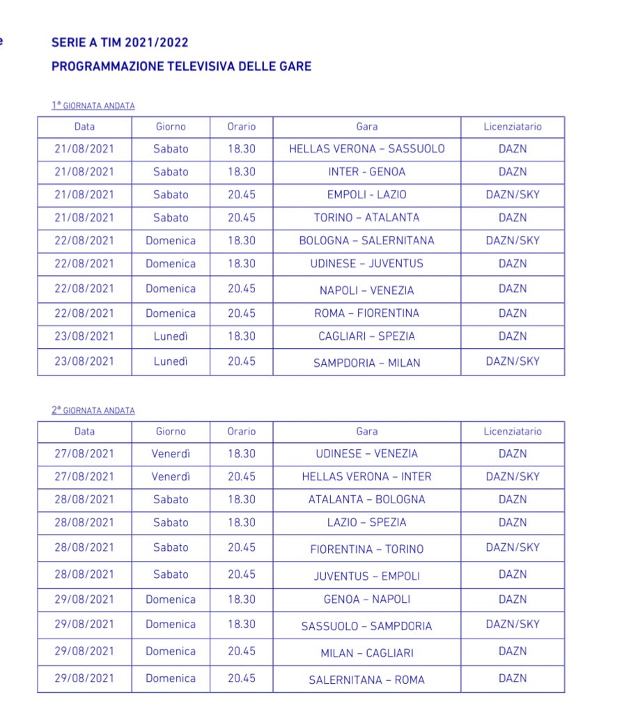 Calcio in TV - Stagione 2021-2022: Programmazione Settimanale